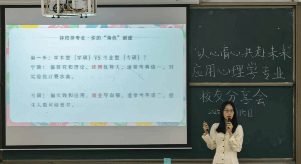 而在第二教学楼114室开展“以心育心,共赴未来”的应用心理学专业校友分享会亦如火如荼进行。分享围绕升学规划与就业发展两大主线,详解国内外硕士申请差异与职业路径选择,提供了心理咨询行业的入行建议,并强调储备关键技能、尽早明确发展方向的重要性。此外,分享会嘉宾还鼓励学子们以积极心态看待专业学习与生活。