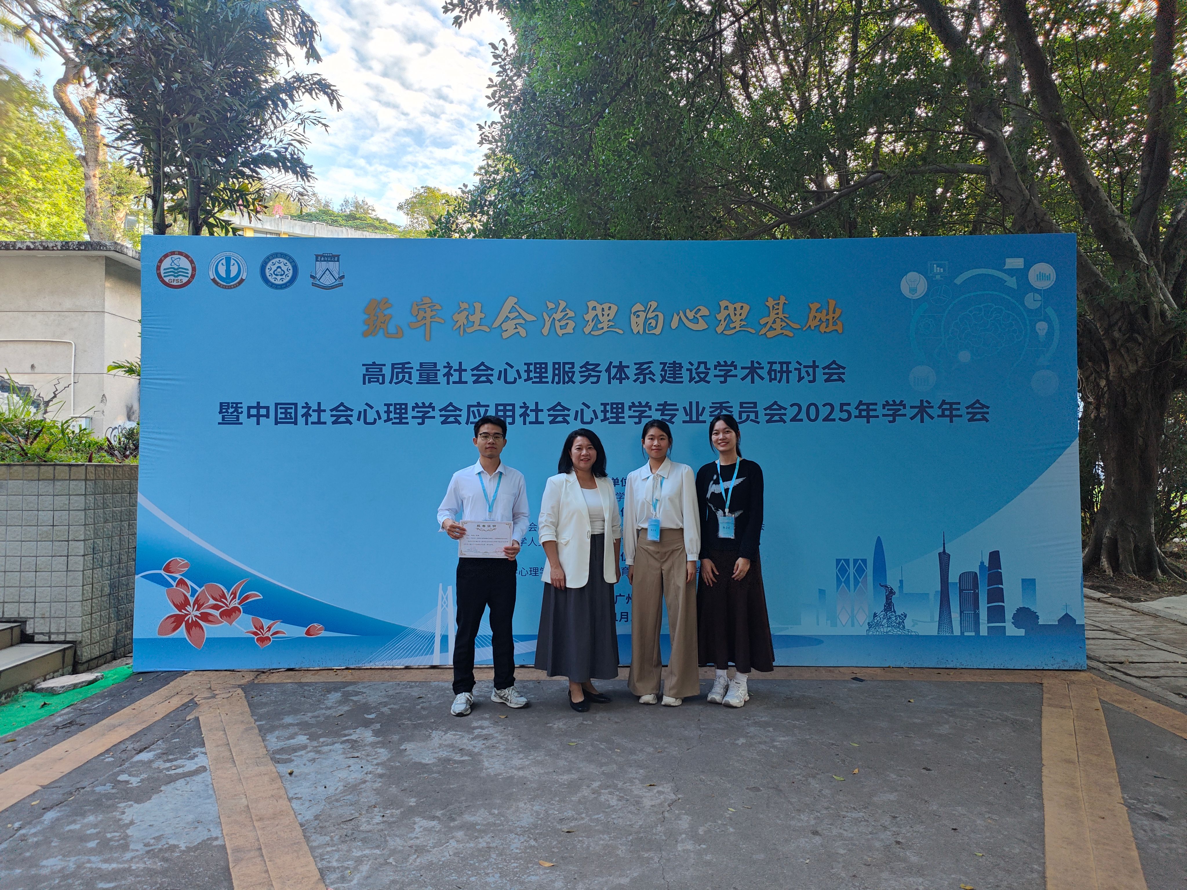 近日,筑牢社会治理的心理基础——高质量社会心理服务体系建设学术研讨会暨中国社会心理学会应用社会心理学专业委员会2025年学术年会,在华南师范大学举行。我院应用心理学专业教师黄玉梅带领本科生陈欣怡、亓琪、李发权参与本次会议,并以第一作者身份完成口头报告交流。