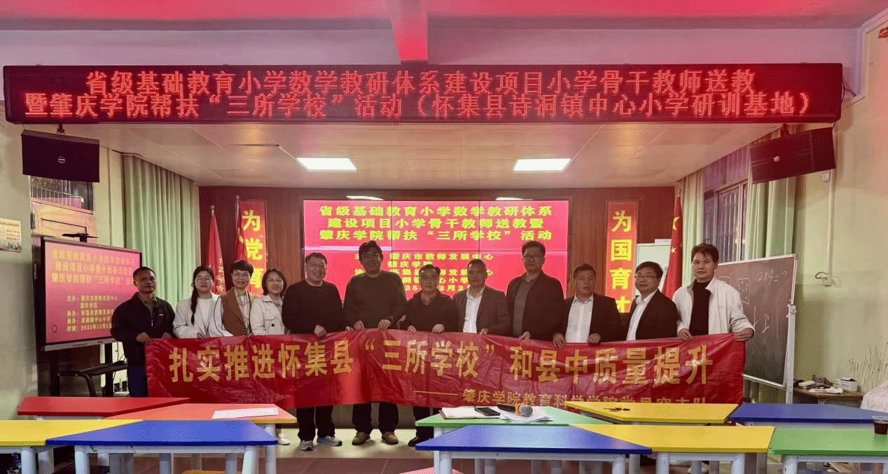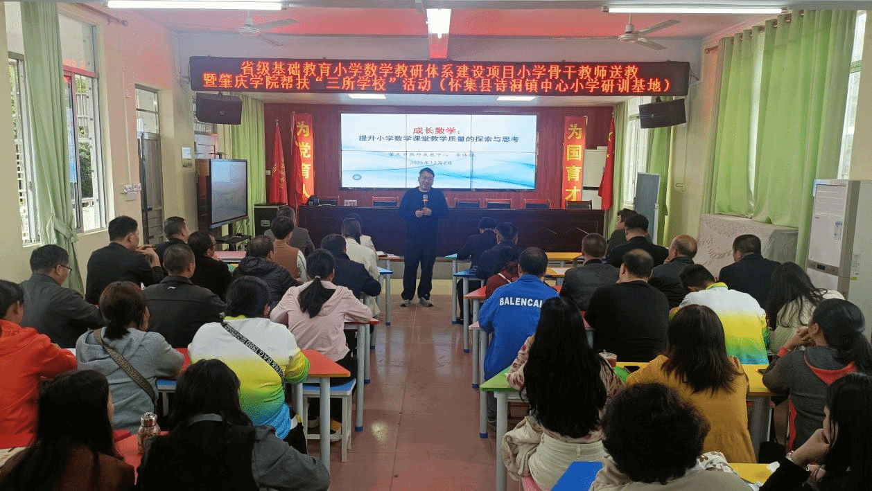 12月2日,怀集县诗洞镇中心小学研训基地成功举办省级基础教育小学数学教研体系建设项目小学骨干教师送教暨肇庆学院帮扶“三所学校”专项活动。肇庆市教师发展中心义务教育教研部部长李伟聪,我院“三所学校”帮扶小组教师代表林叶舒、梁琰,怀集县教师发展中心培训处老师刘庆、李嘉强以及由肇庆市第十五小学教育集团校长郭巧华率领的送教送培团队,莅临怀集县诗洞镇中心小学研训基地,与来自南片区(诗洞镇、桥头镇、永固镇)三所中心小学的80余名教师共同参与了此次活动。